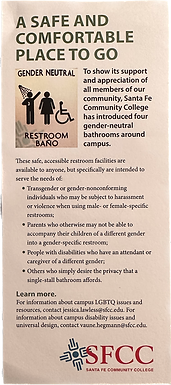 When I started teaching at Santa Fe Community College in Santa Fe, New Mexico in 2009, my partner came to campus for a Spanish class and didn’t have a place to pee. The only bathrooms were multi-stalls marked Women or Men. I saw an opportunity to do something when I was invited to lead a gender 101 professional development workshop for campus faculty and administrators. Giving my collegues an assignment I usually did with students, they realized they could use ADA money to upgrade bathrooms for trans folks and also for disabled community members. Importantly, I helped them understand single stall bathrooms supported needs of parents and other caretakers of young children, as well as women and other people who menstruate. The Director of Disability was on-board, as was the Chair of the President’s Diversity Committee. And the new college archetect was a gay man who wanted to be an ally to trans youth. I was invited to lead a committee made up of faculty, students, and staff where we successfully had several single-stall bathrooms added to an existing ADA construction project.